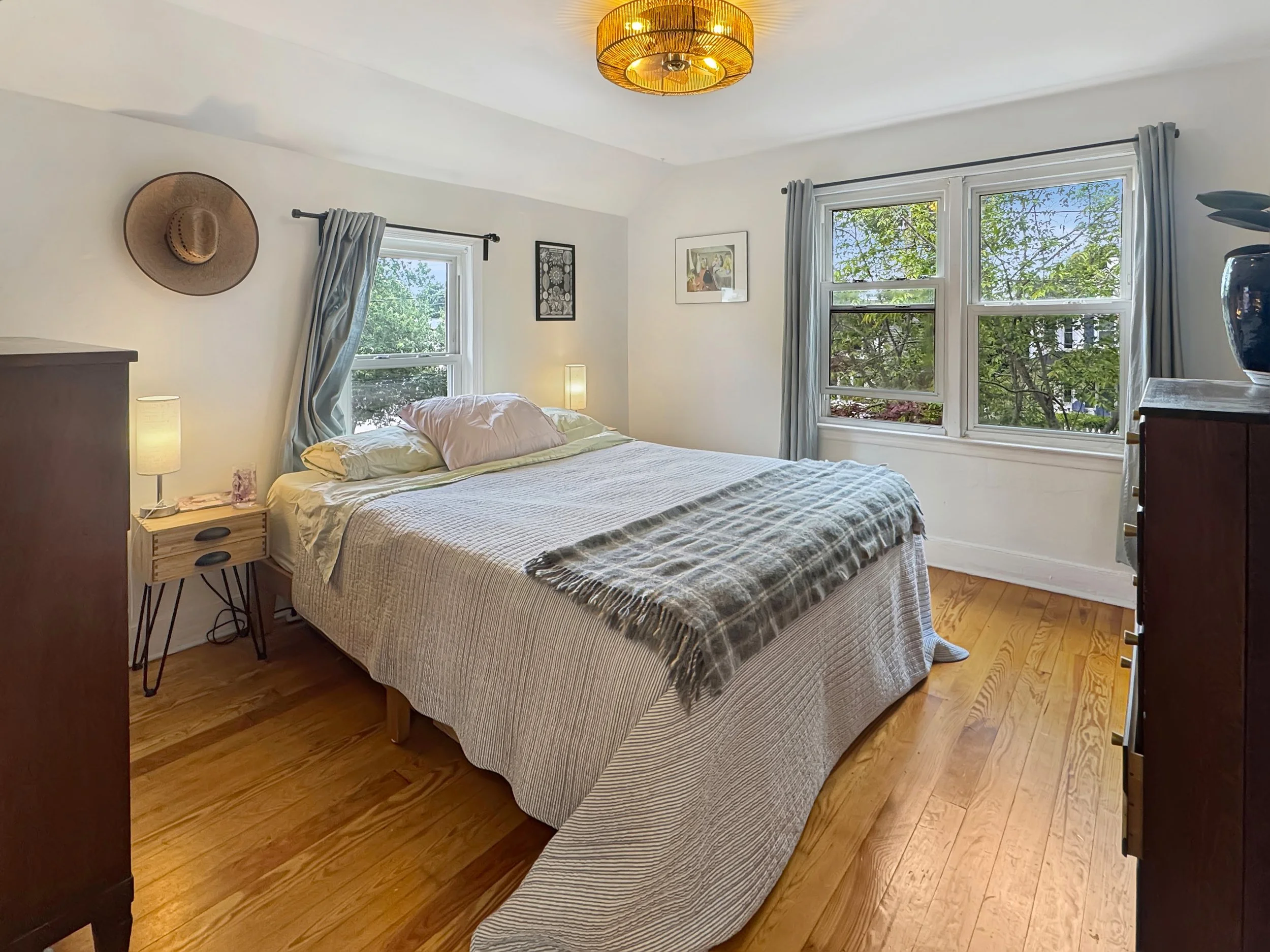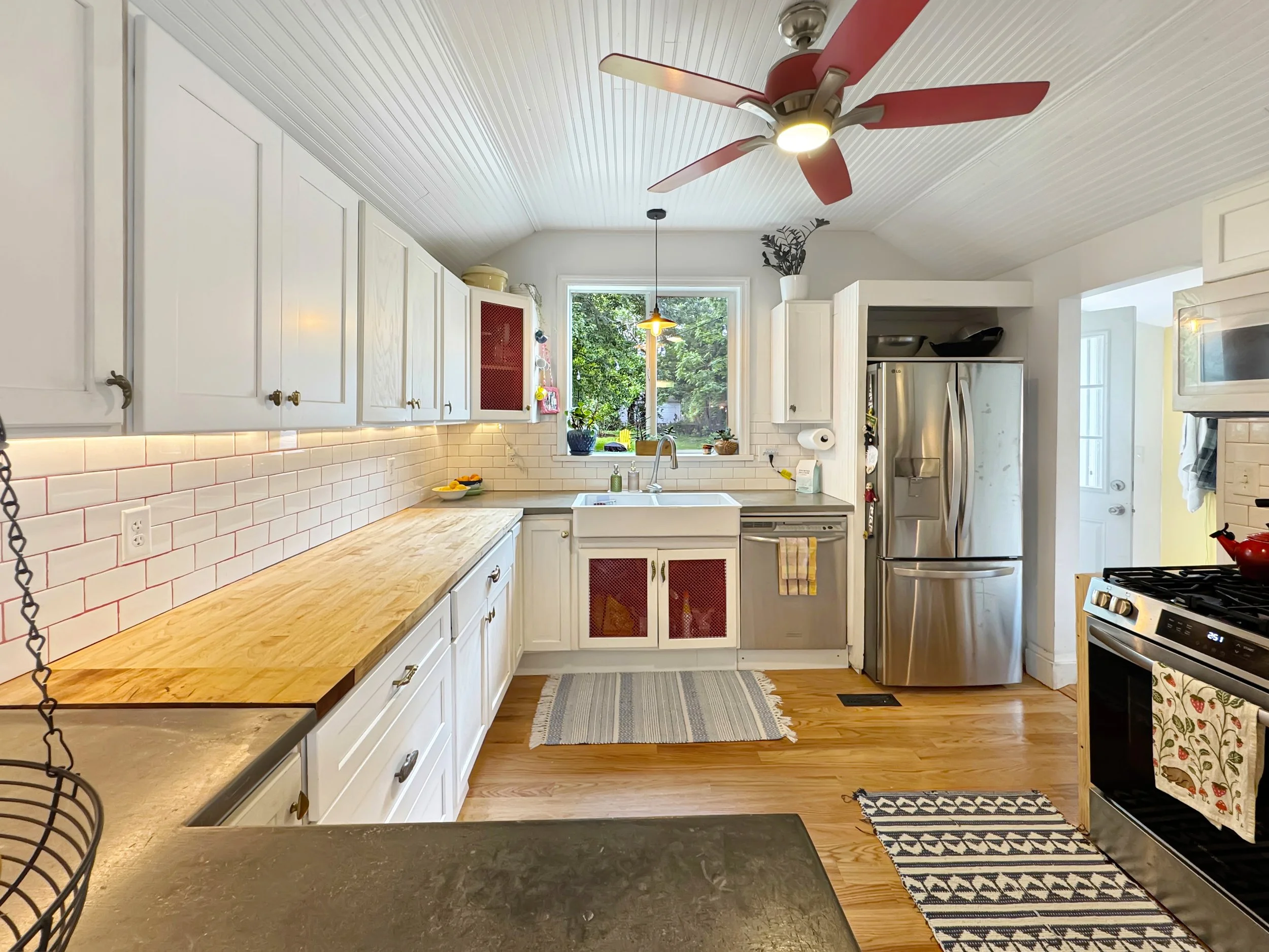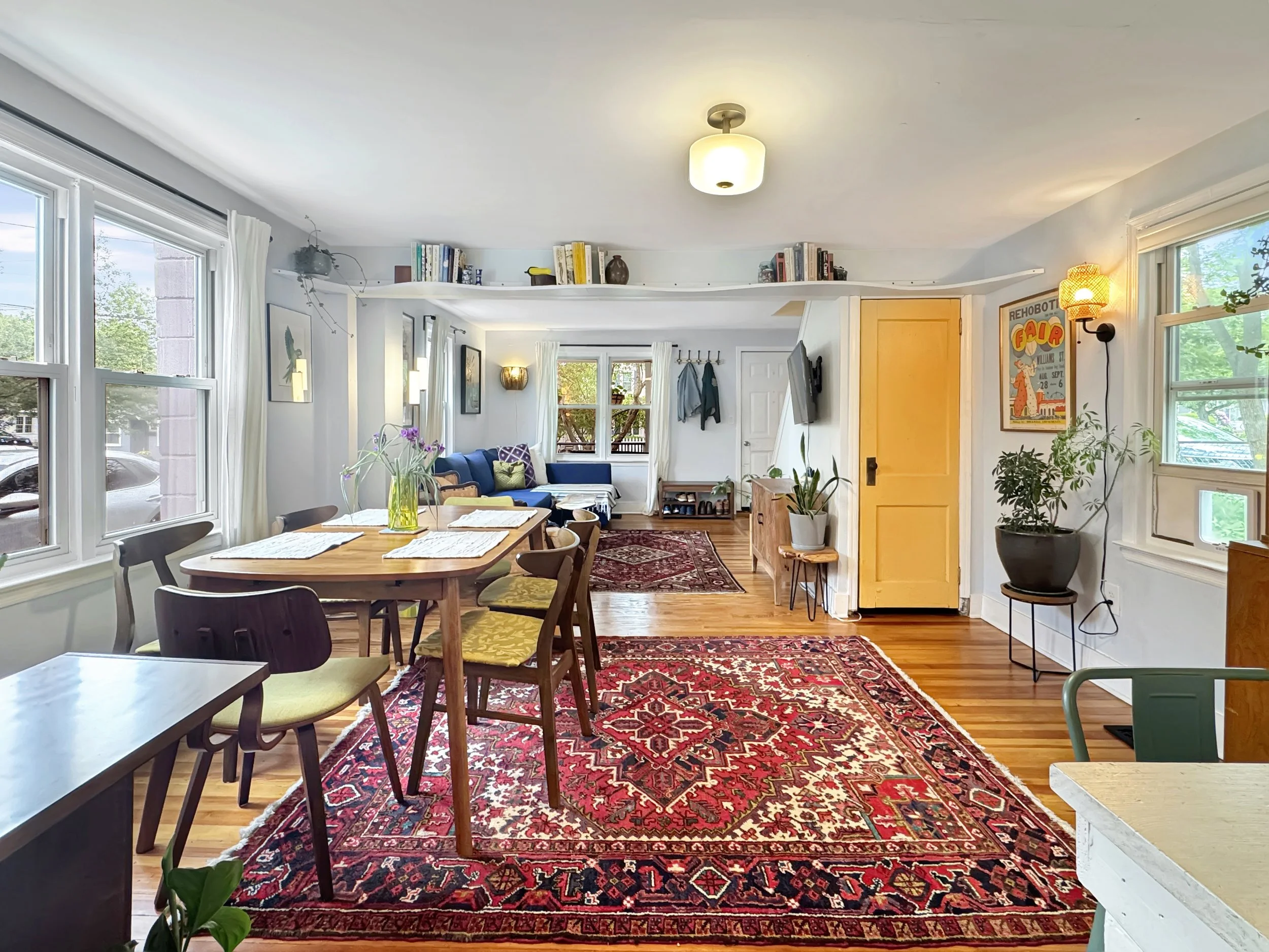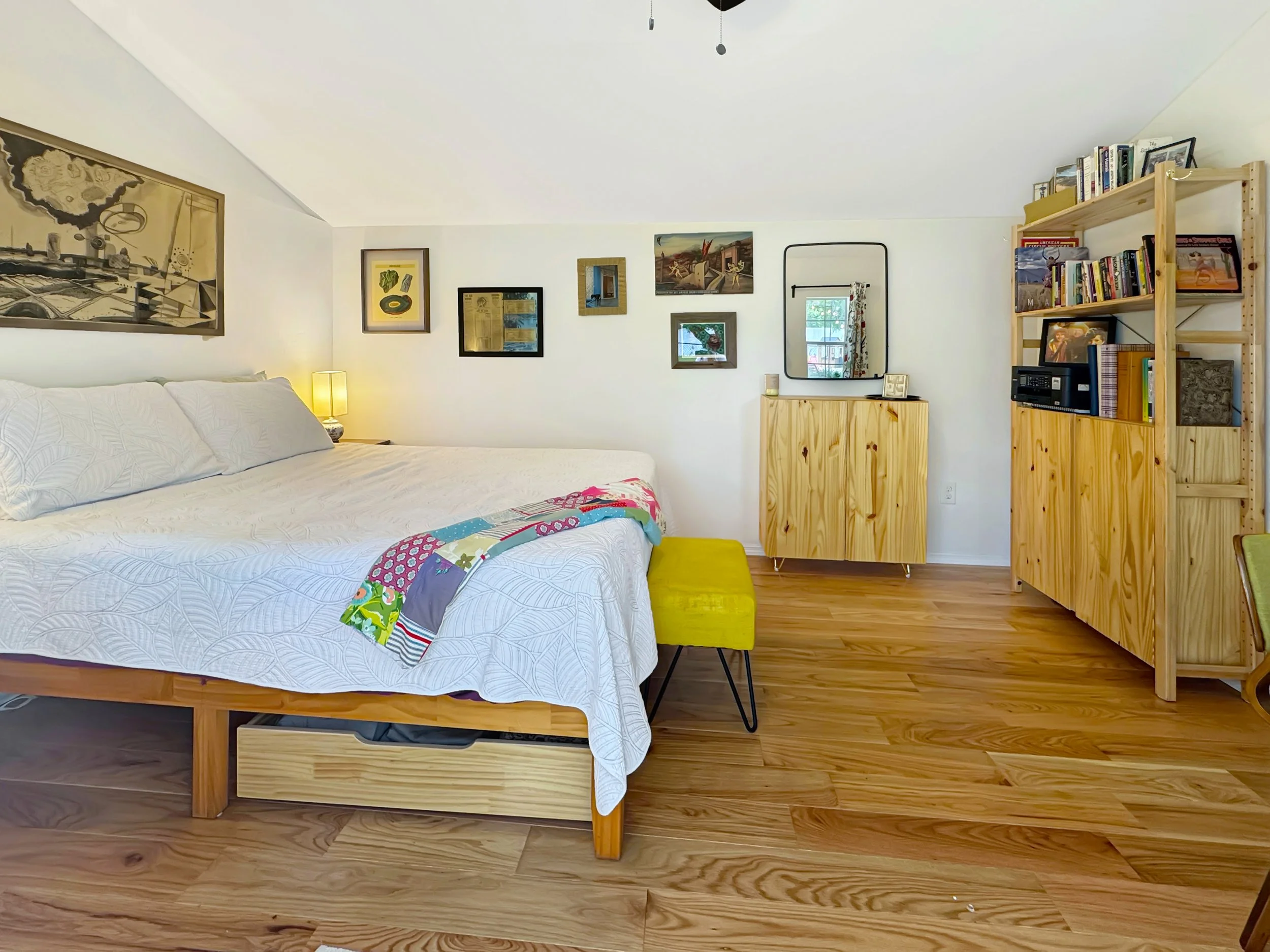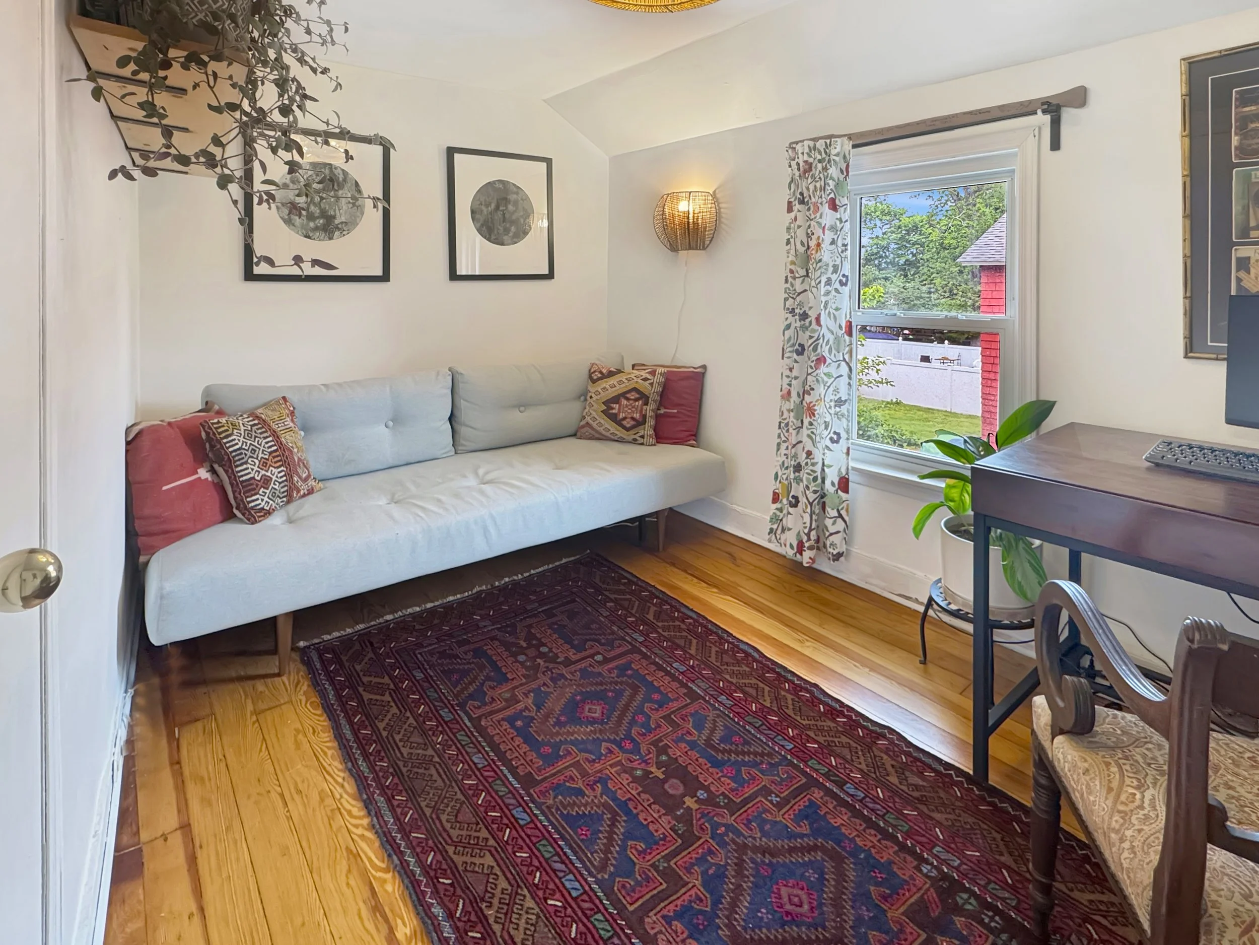 PAtchogue Vacation Cottage + Shedlet Mid-century bohemian furnishing, wallpaper, paint, and floors in a 1920s Long Island beach cabin.